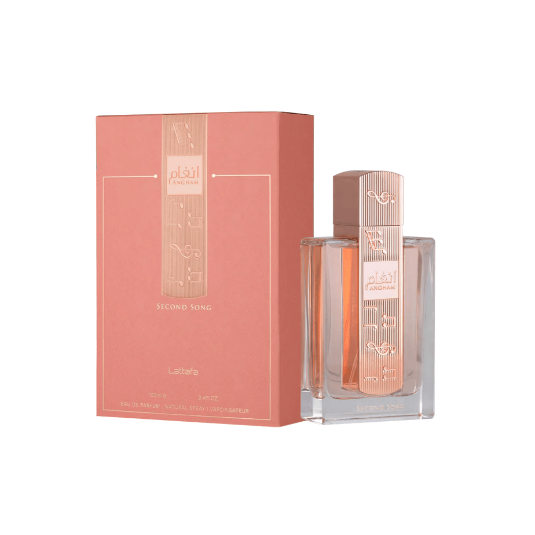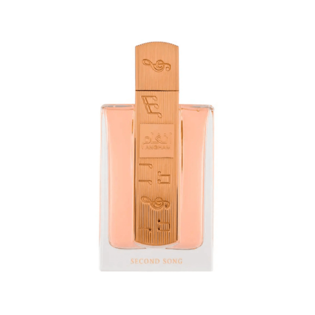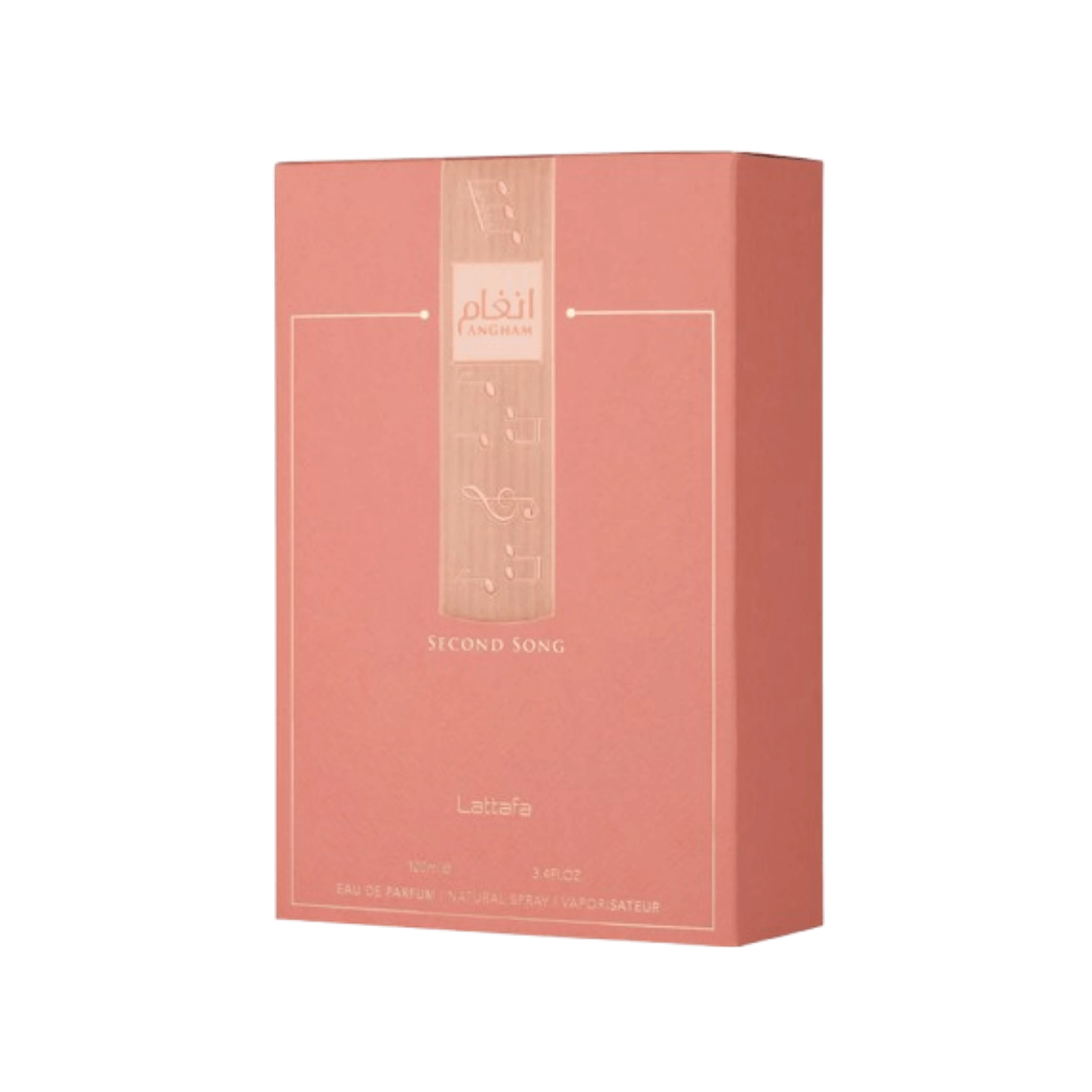 Angham Second Song de Lattafa est un parfum moderne et féminin, qui s'ouvre sur de la bergamote et de la fleur de poirier, évolue vers de la fleur d'oranger, de la pivoine et une touche de praliné, et se termine enfin par de la vanille, des fèves tonka, de l'ambroxan et du musc pour une finale douce et élégante.